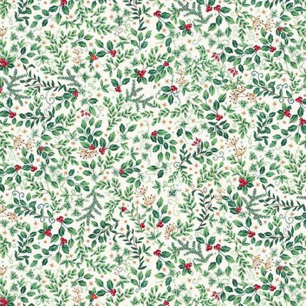 234-Q Evergreen Cream, Country Christmas by Makower is a pattern of leaves, branches, and holly on a cream background.
