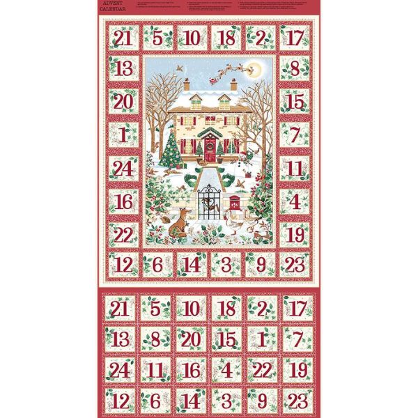 238-R Advent Red Panel, Country Christmas by Makower is an advent panel featuring a beautiful snowy cottage with Santa’s sleigh in the sky and animals including a fox, geese, birds and hares.