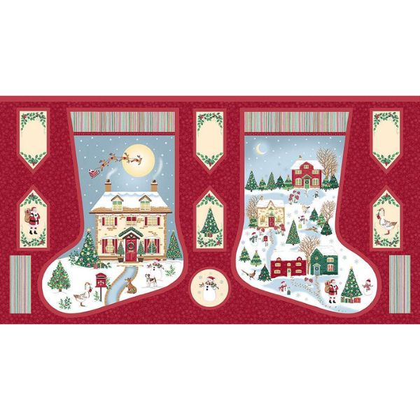 239-1 Stocking Multi, Country Christmas by Makower is a 24″ x 44″ stocking panel featuring a beautiful cottage and village scene in the snow with trees, snowmen, Santa and woodland animals.