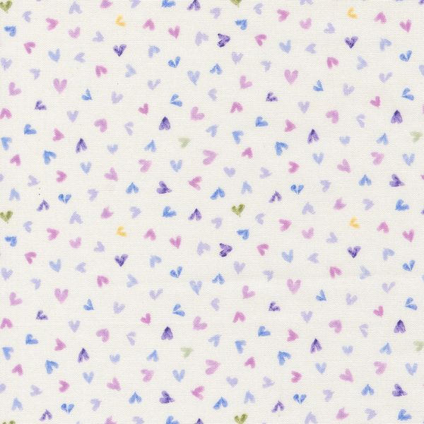 24653 11 Light Hearts on Snowdrop, Delphinium by Janet Clare features colourful hearts on a cream background.