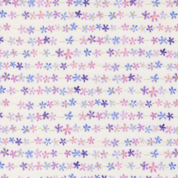 24655 11 Daisy Chain Stripes on Snowdrop, Delphinium by Janet Clare features stripes of pastel daisy chains. Perfect for a spring quilting project.