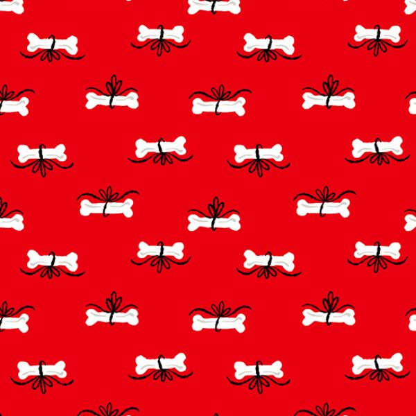2586 R Holiday Bones on Red by Andover Fabrics features canine treat bones all decked out for the holidays with ribbons, on a red background. Furry and Bright Collection by Andover Fabrics is a retro Christmas-themed fabric collection.