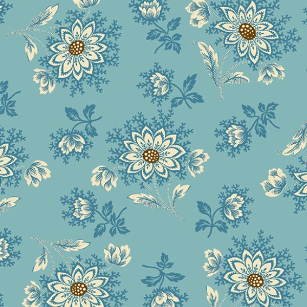 2688 T Jody in Teal, Sienna by Max & Louise. This fabric features a floral print. This fabric is from a new collection of vintage floral prints in soft mints, mauve, pink and blues.