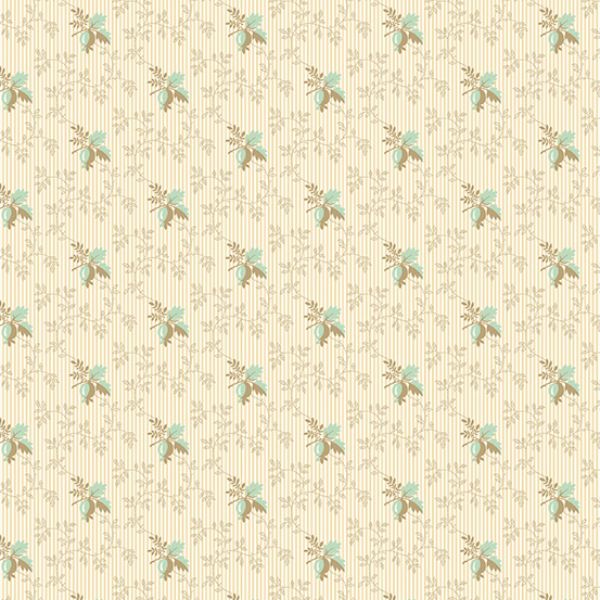 2692 LG Berry Sprig in Light Mint, Sienna by Max & Louise. This fabric features a delicate floral design, all over on a background of stripes. This fabric is from a new collection of vintage floral prints in soft mints, mauve, pink and blues.