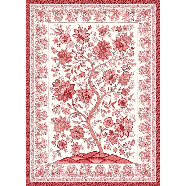 29130 11 Panel, Bordeaux by Deborah Edwards is a gorgeous yard panel featuring a pink tree with ornate flowers blooming from its branches. The tree is bordered by a beautiful floral pattern of red and pink flowers.