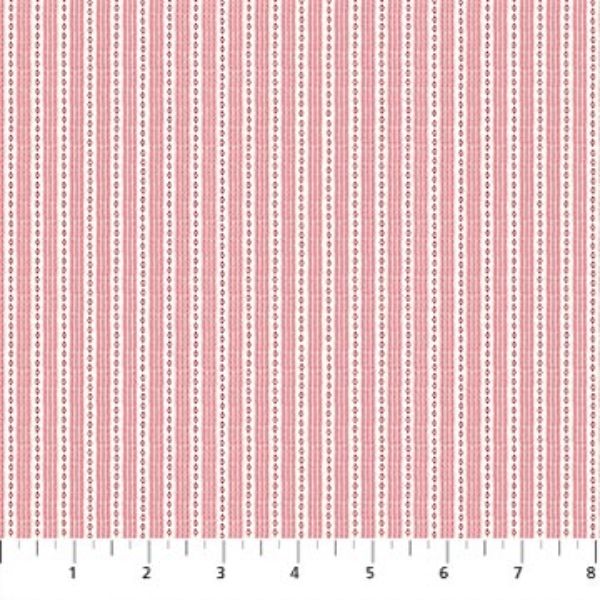 29140 11 Bordeaux by Deborah Edwards is a striped pattern featuring slim pink lines and dots on a white background.