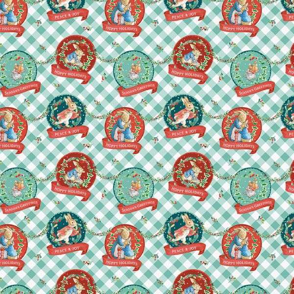 3262-05 Festive Gingham Hoppy Holidays is perfect for little ones. Peter Rabbit and friends Christmas themed badges all over. Join Peter Rabbit and all of his woodland friends as they get up to all sorts of festive fun. Based on the classic tales by Beatrix Potter. Enjoy a range of fabrics with beautiful illustrations. Ideal for patchwork and quilting projects.