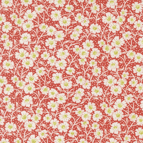 35424 14 Picnic Bloom Strawberry, Rosie by Fig Tree & Co is a design of ditsy little cream and green on a red background.