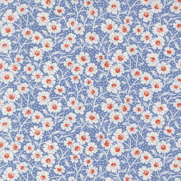 35424 18 Picnic Bloom Blueberry, Rosie by Fig Tree & Co is a design of ditsy little cream and red on a blue background.