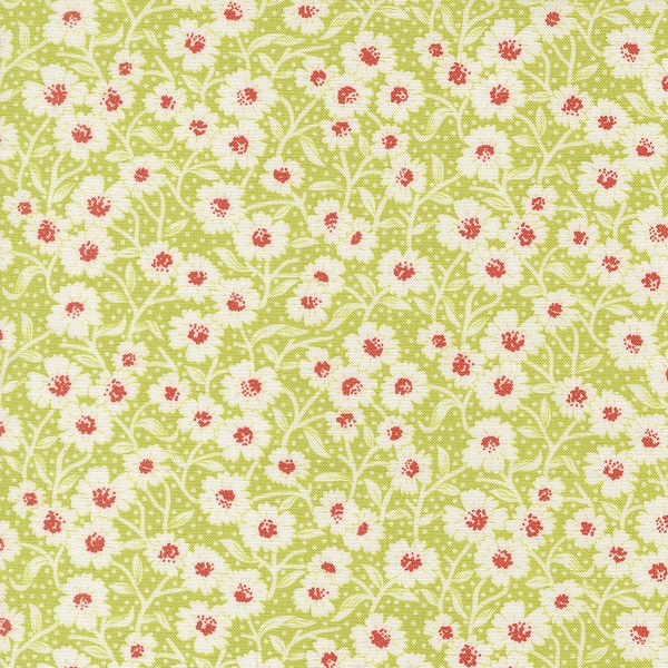 35424 20 Picnic Bloom Green Apple, Rosie by Fig Tree & Co is a design of ditsy little cream and red on a green background.