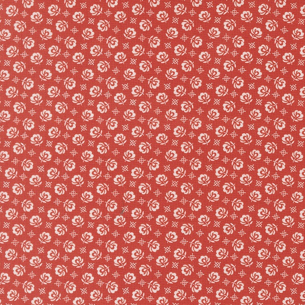 35425 14 Prairie Toss Strawberry, Rosie by Fig Tree & Co is a design of small cream flowers and geometric motifs on a red background.
