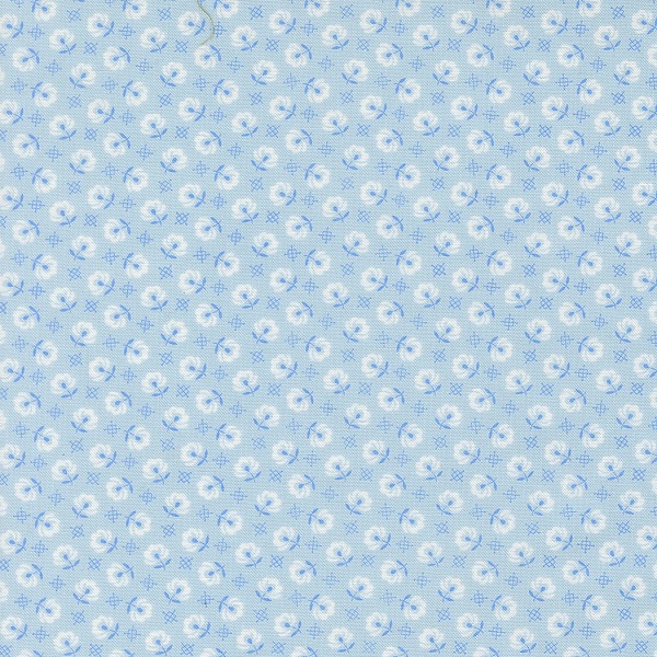 35425 16 Prairie Toss Forget Me Not, Rosie by Fig Tree & Co is a design of small cream flowers and blue geometric motifs on a blue background.