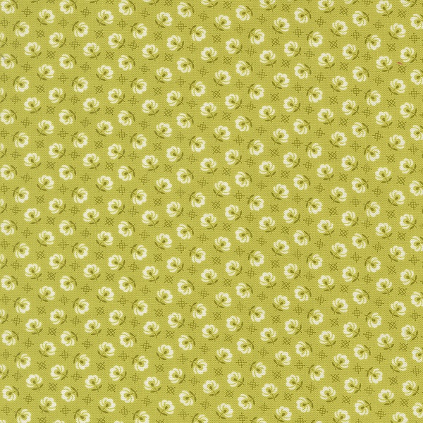 35425 20 Prairie Toss Green Apple, Rosie by Fig Tree & Co is a design of small cream flowers and green geometric motifs on a green background.