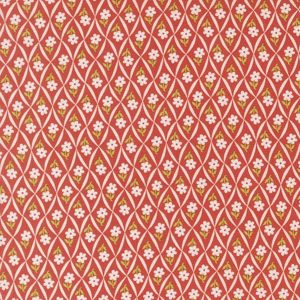 35426 14 Climbing Daisy Strawberry, Rosie by Fig Tree & Co is a design of cream diamonds containing single daisies on a red background.