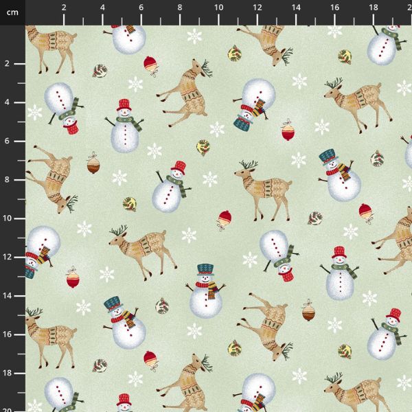 3607-16 Tossed Reindeer, Nordic Holiday Village by Mary Jane Carey features cute reindeer, snowmen and snowflakes on a light sage green background.