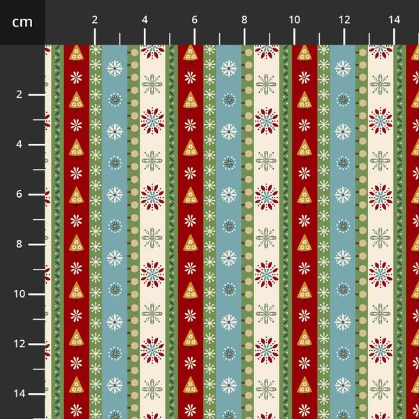 3611-17 Mini Stripe, Nordic Holiday Village by Mary Jane Carey features a pattern of festive columns containing Christmas trees and snowflakes.