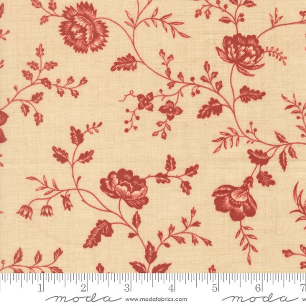 36155 15 Dauphin Florals Toile Pearl, Le Jardin Rouge by French General features a beautiful design of red flowers and leaves on a pearl background.