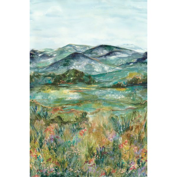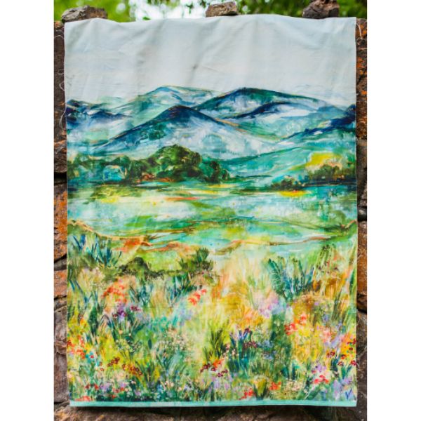 39852 11 Mountains Panel, Wanderlust by Create Joy Project is a half yard panel of a watercolour design of a green and flowering field in front of mountains and a blue sky.