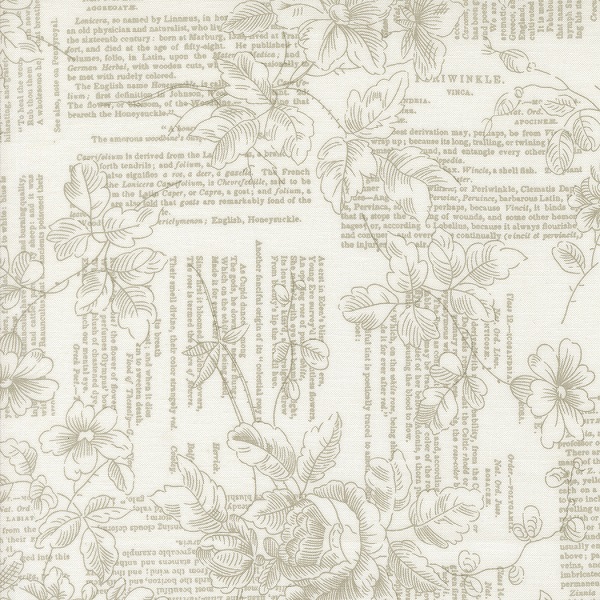 44392 11 Porcelain, Muse by 3 Sisters is a design of outlined florals over a cream background with text.