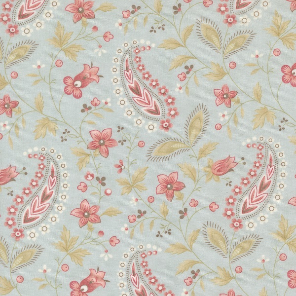 44393 12 Sky, Muse by 3 Sisters is a pink and green floral paisley design on a blue background.