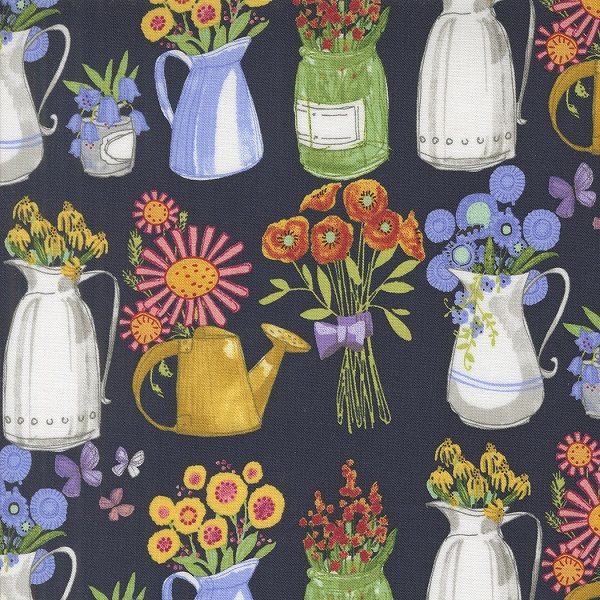 48782 16 Indigo, Superbloom by Robin Pickens is a design of bunches of flowers in watering cans and jugs on a dark blue background.