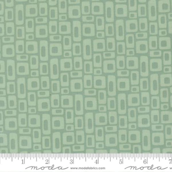 The design features a playful geometric pattern of overlapping rounded rectangles in a dusty jade. This combines mid century charm with modern colour, making it perfect for quilts, bags, and contemporary sewing projects.
