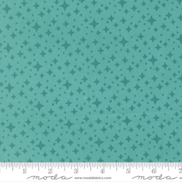 The design features a subtle scatter of fine star shapes across a cool poolside turquoise blue background. This print offers gentle texture and fresh colour ideal for quilt backgrounds, sashing or adding a serene accent to modern sewing projects.