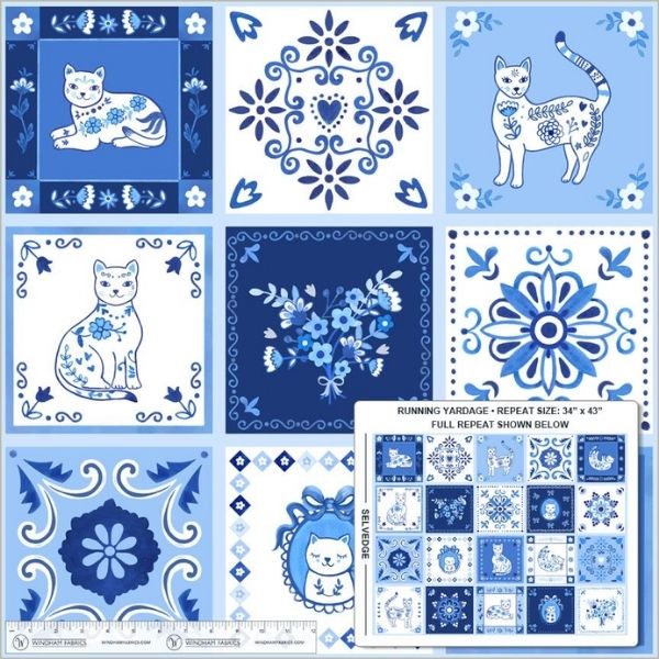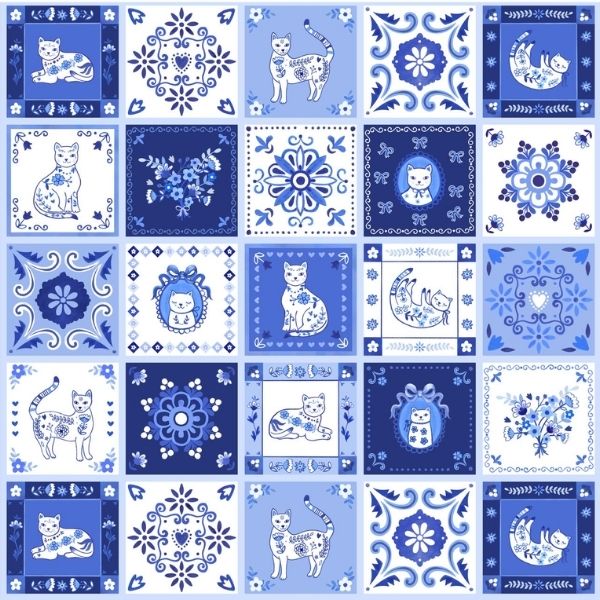 55341D-1 Panel, Chateau Meow by Whistler Studios is a beautiful panel featuring twenty squares of porcelain inspired motifs. The motifs include floral tiles, portraits of cats, and playful cats in various poses—curled up, stretching, and adorned with hearts and floral accents.