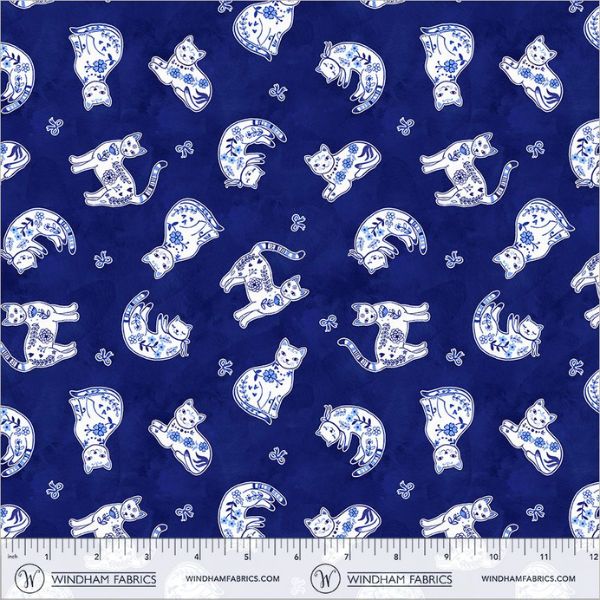 55344-3 Purrcelain Cats, Chateau Meow by Whistler Studios is a beautiful print of white porcelain-inspired cats on a royal blue background. Each feline figure is intricately detailed with blue floral motifs and delicate patterns, playfully scattered in various poses—curling tails, arched backs, and graceful stretches—creating a sophisticated yet fun design perfect for cat lovers.