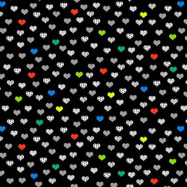 5808-98 Black Multi Hearts multicoloured hearts in a repeating pattern on a black background. Black & White With a Touch of Bright by Victoria Borges for Studio E Fabrics. This fun collection features co-ordinating patterns in black and white with pops of bright colours. Funky and modern fabric collection perfect for patchwork and quilting projects.