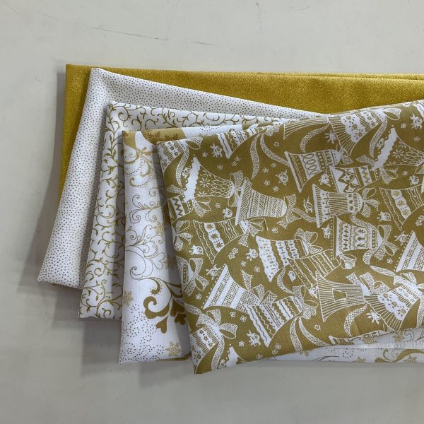 Gold Metallic Fat Quarter Pack consists of five gold metallic fabrics. Please note fabric choice may vary.