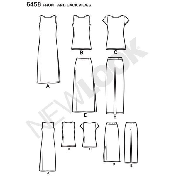 New Look Just 4 Knits wardrobe pattern includes knit tank, tee shirt, pull on Trousers, maxi skirt and maxi dress with side slits. Easy to sew & great for travel.