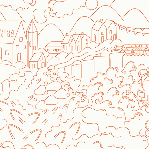 8071L Sunprints Luminance, Alison Glass is a print of fun orange outlined shapes on a white background.