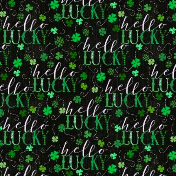 9738-69 Green Words on Black by Andrea Tachiera features ‘Hello Lucky’ writing in green on a black clover print background. Hello Lucky is a great St Patrick’s day themed collection. Andrea Tachiera captures the fun of StPatrick’s Day in this collection. Including all shades of green, shamrocks, dancing leprechauns and pots of gold.