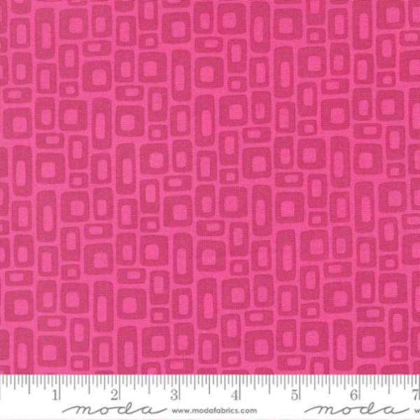 The design features a lively geometric pattern of overlapping rectangles and ovals in rich shades of fuchsia. This bold and playful print from Elizabeth Hartman’s Scenery collection for Moda Fabrics adds a modern pop of colour and texture, perfect for creating vibrant quilts, accents, and contemporary sewing projects.