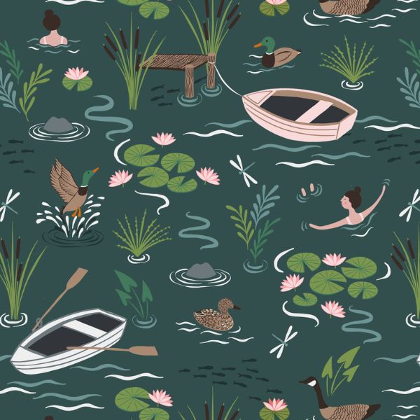 A625.3 A Dip in the Lake at Dusk, On the Lake by Lewis & Irene is a design of a dark blue lake with swimmers, boats, wildlife and plants.