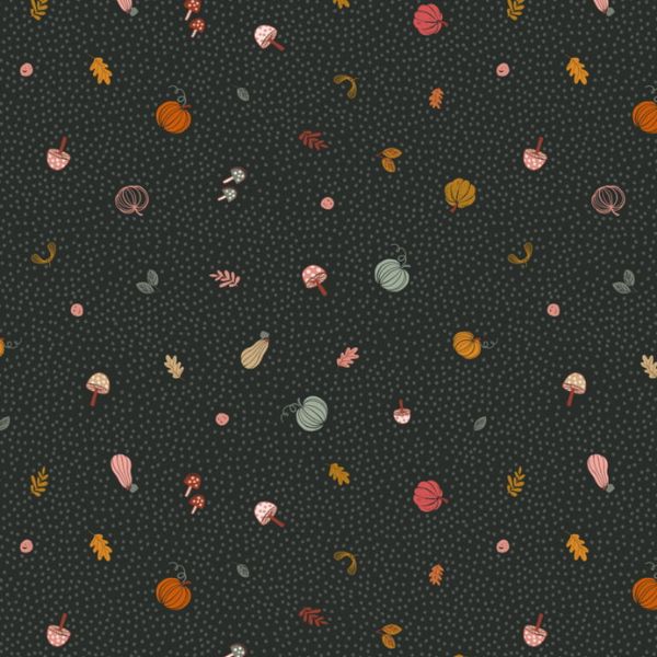 A683.3 Little Pumpkins in Dark Forest, Snuggle Season by Lewis & Irene features adorable little pumpkins, mushrooms and leaves on a dark background.