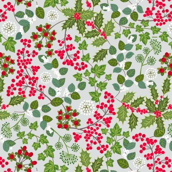 A784.1 Holly and Ivy Silver by Lewis and Irene is a beautiful fabric featuring shimmering pearl elements. Ideal for patchwork and quilting projects.