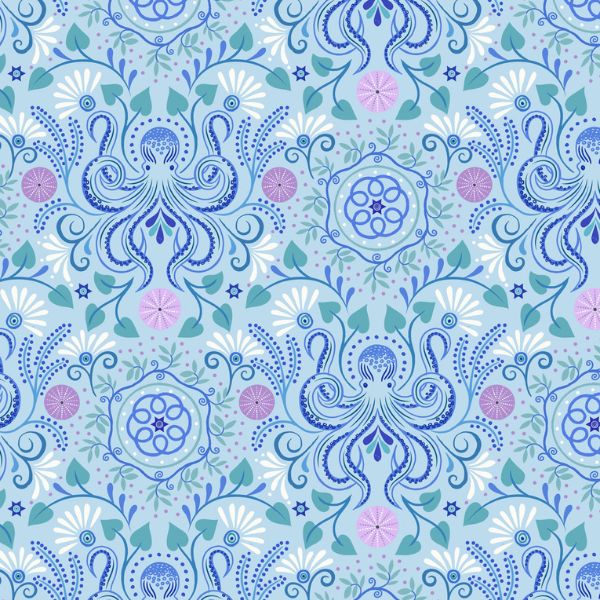 A802-3 Χάλκη (Chalki), Chalki on Light Blue, Lewis & Irene. A beautiful design of octopus, sea urchin shells and florals on a light blue background.
