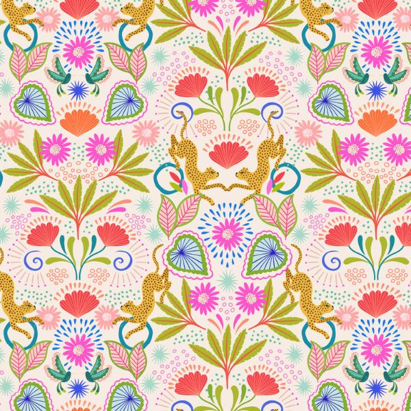 A809-1 Bahia, Mirrored Jaguar on Cream, Lewis & Irene. A fabulous design of carnival inspired jaguars, flowers and exotic leaves on a cream background.