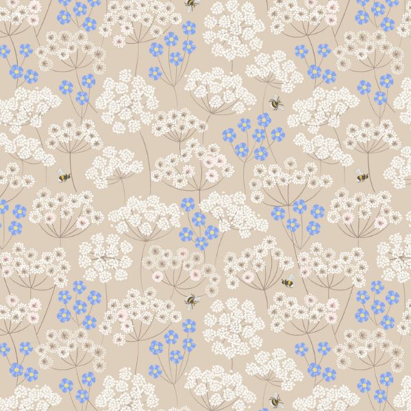 A814.3 Clearbury Down – Wild Meadows With Bees on Light Clay, by Lewis & Irene. From the Clearbury Down collection by Lewis & Irene featuring blue and white wild meadow flowers and bees on a light clay background.