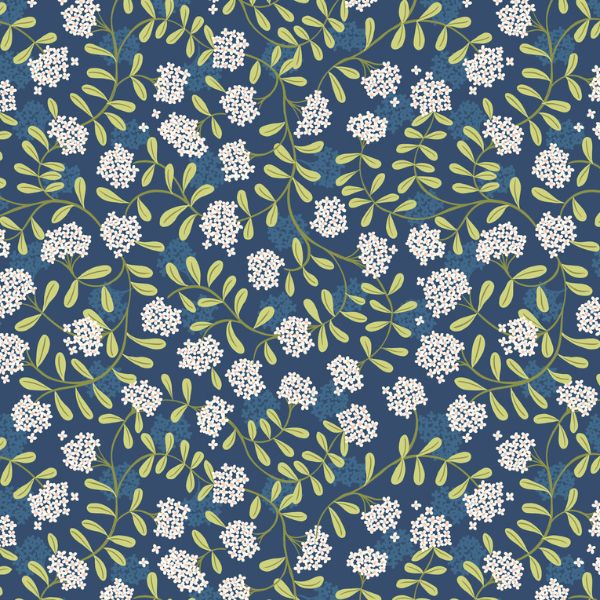A816.3 Clearbury Down – Wild Thyme on Dark Blue, by Lewis & Irene. From the Clearbury Down collection by Lewis & Irene featuring white wild meadow flowers with swirling green leaf stems on a dark blue background.