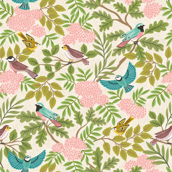 A817.1 Clearbury Down – Birds on Cream, by Lewis & Irene. From the Clearbury Down collection by Lewis & Irene featuring pink, blue and yellow swallows nestling in a striking leafy, floral setting, on a cream background.