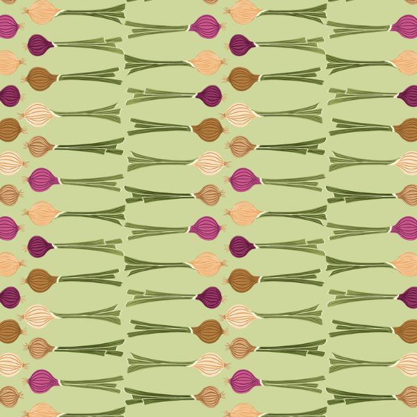 A822-3 The Kitchen Garden – Onion Stripe on Green, Lewis & Irene. A delightful pattern of delicious onions in a variety of colours, all featured on a green background.