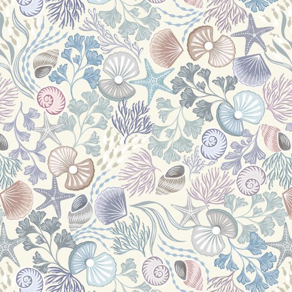Featuring shells, ocean plants and fish on a cream background.
