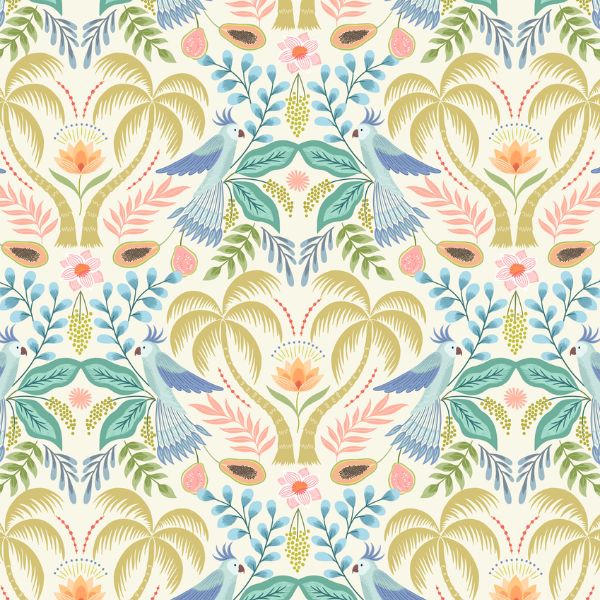 A887A Paradise on Cream, Paradise by Lewis & Irene features palm trees, tropical birds and fruits on a cream background.