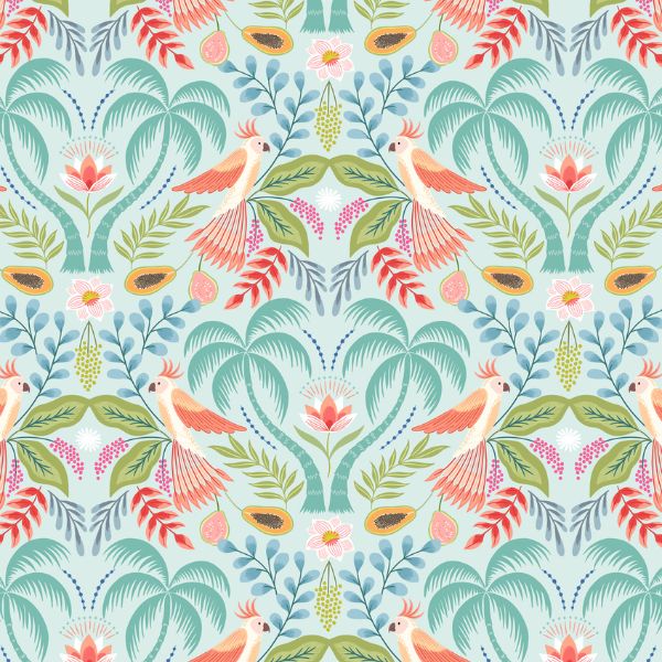 A887C Paradise on Aqua, Paradise by Lewis & Irene features palm trees, tropical birds and fruits on an aqua background.