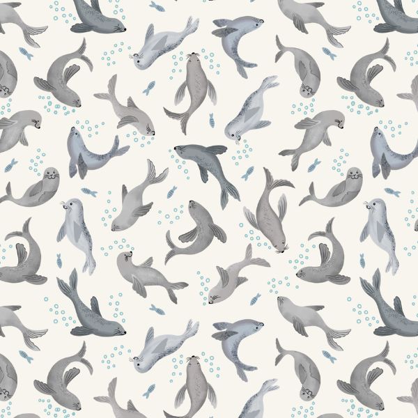 A897A Seal Bubbles on Cream, Puffin Rock by Lewis & Irene is a design of playful swimming seals on a cream background.