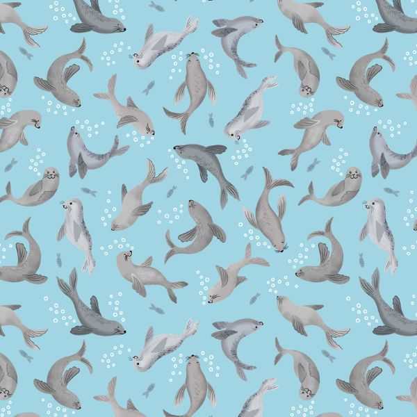 A897B Seal Bubbles on Light Blue, Puffin Rock by Lewis & Irene is a design of playful swimming seals on a light blue background.