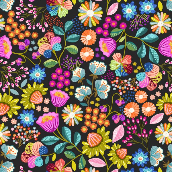 A908C Creative Landscapes Flowers on Black, Creative Landscapes by Lewis & Irene features bright bold florals on a black background.